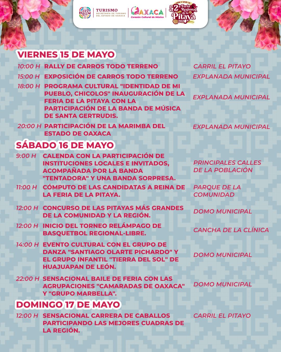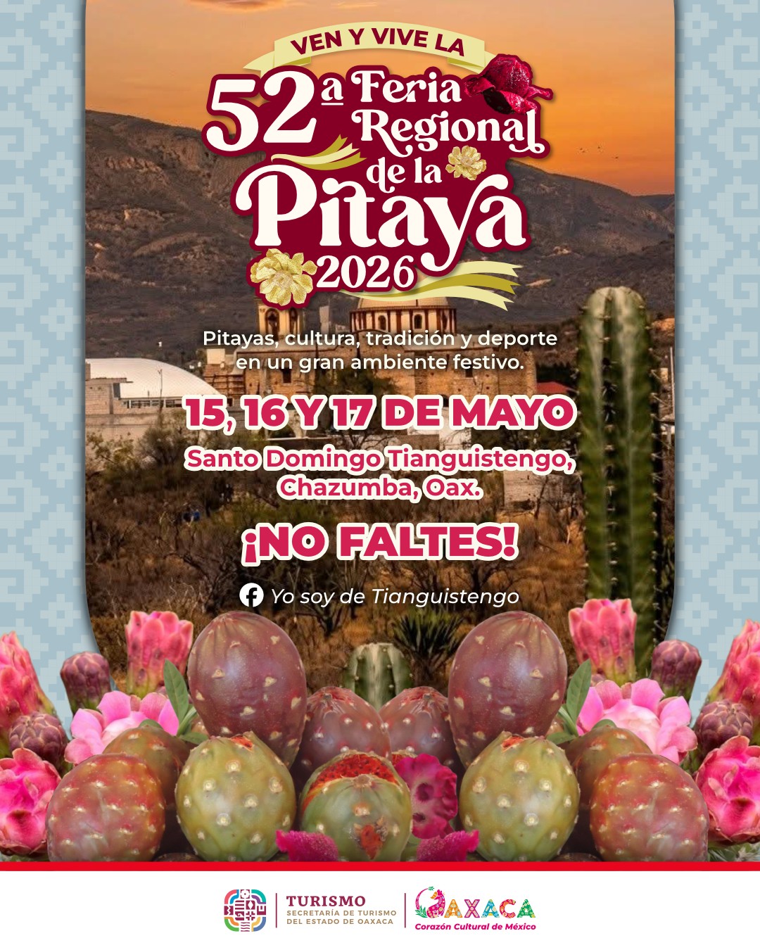 🎉 Descubre la 52ª Feria Regional de la Pitaya 2026 y sumérgete en un viaje de sabores, cultura y tradición. Del 15 al 17 de mayo, Santo Domingo Tianguistengo, en Chazumba, Oaxaca, se llena de color y vida para recibir a visitantes de todas partes.