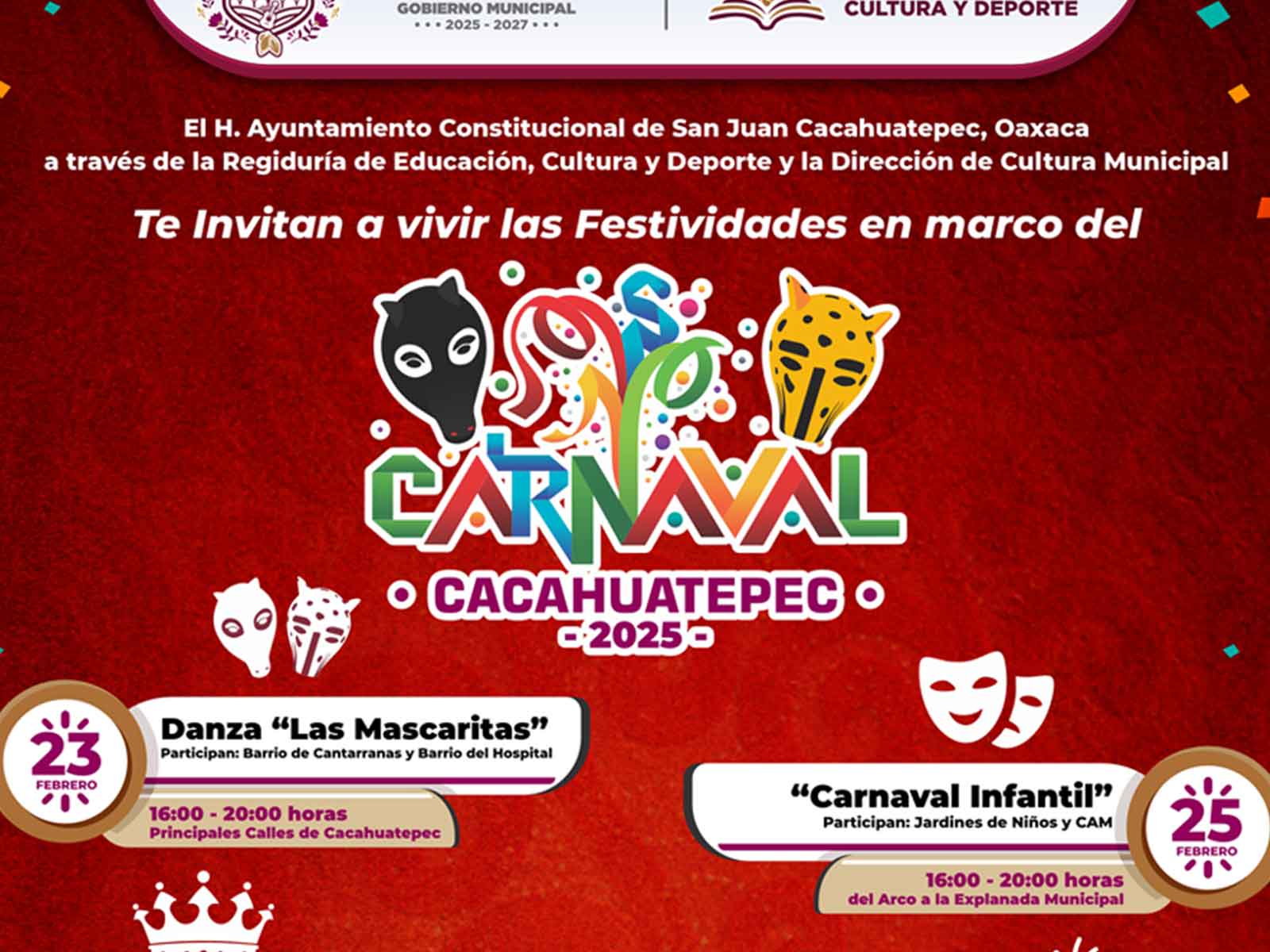 Vive las festividades del Carnaval de Cacahuatepec 2025, disfruta de la Calenda Monumental, el Carnaval Infantil, Concurso de disfraces y Reina del Carnaval.