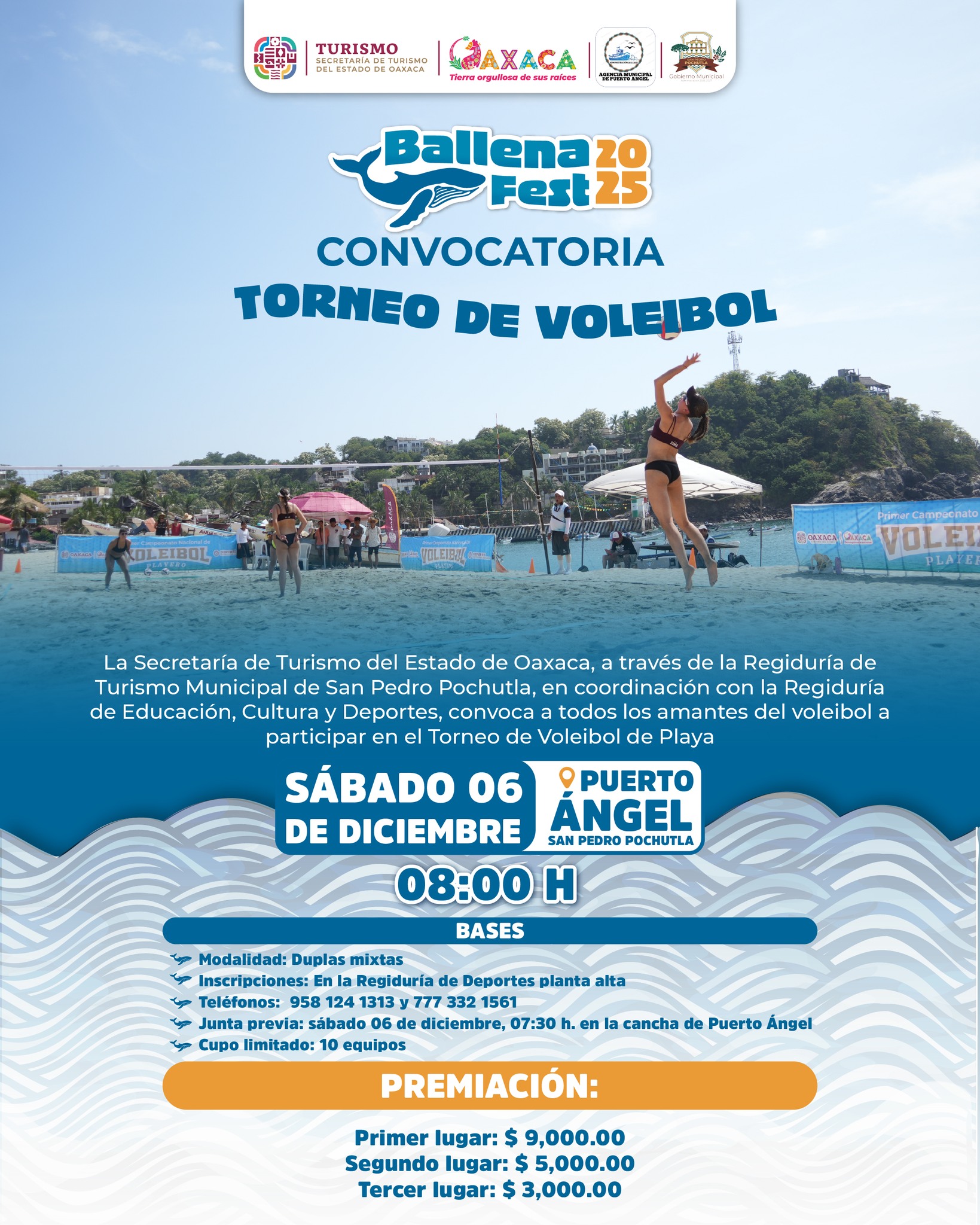 🏐 Participa en el Torneo de Voleibol de Playa en Puerto Ángel, dentro del marco del Ballena Fest 2025 🌊