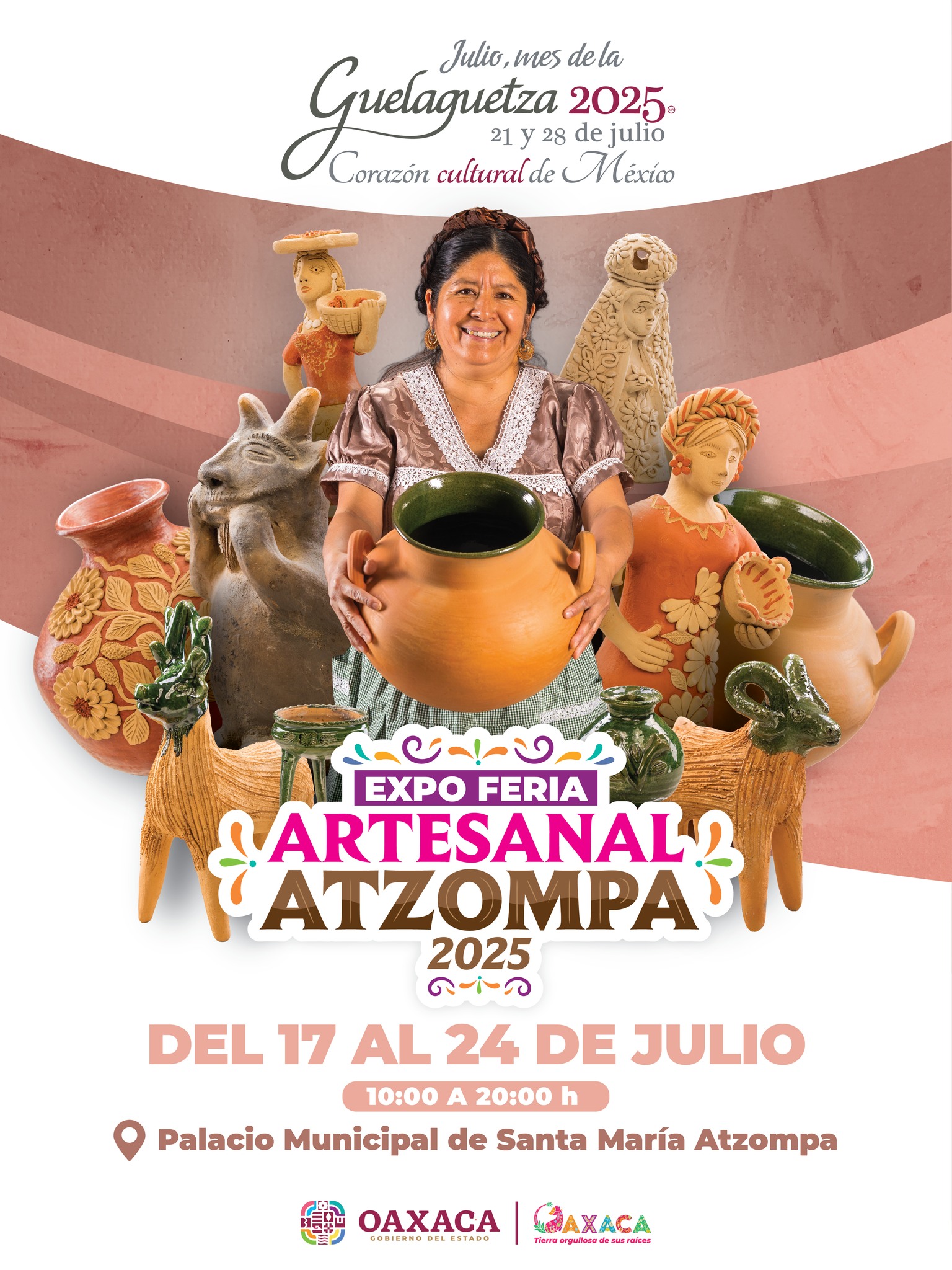 Del 17 al 24 de julio, visita la Expo Feria Artesanal Atzompa 2025 en el Palacio Municipal de Santa María Atzompa, a tan solo 30 minutos de la Ciudad de Oaxaca. De 10:00 a 20:00 h, admira la belleza del barro trabajado con manos expertas que moldean identidad, historia y creatividad en cada pieza.