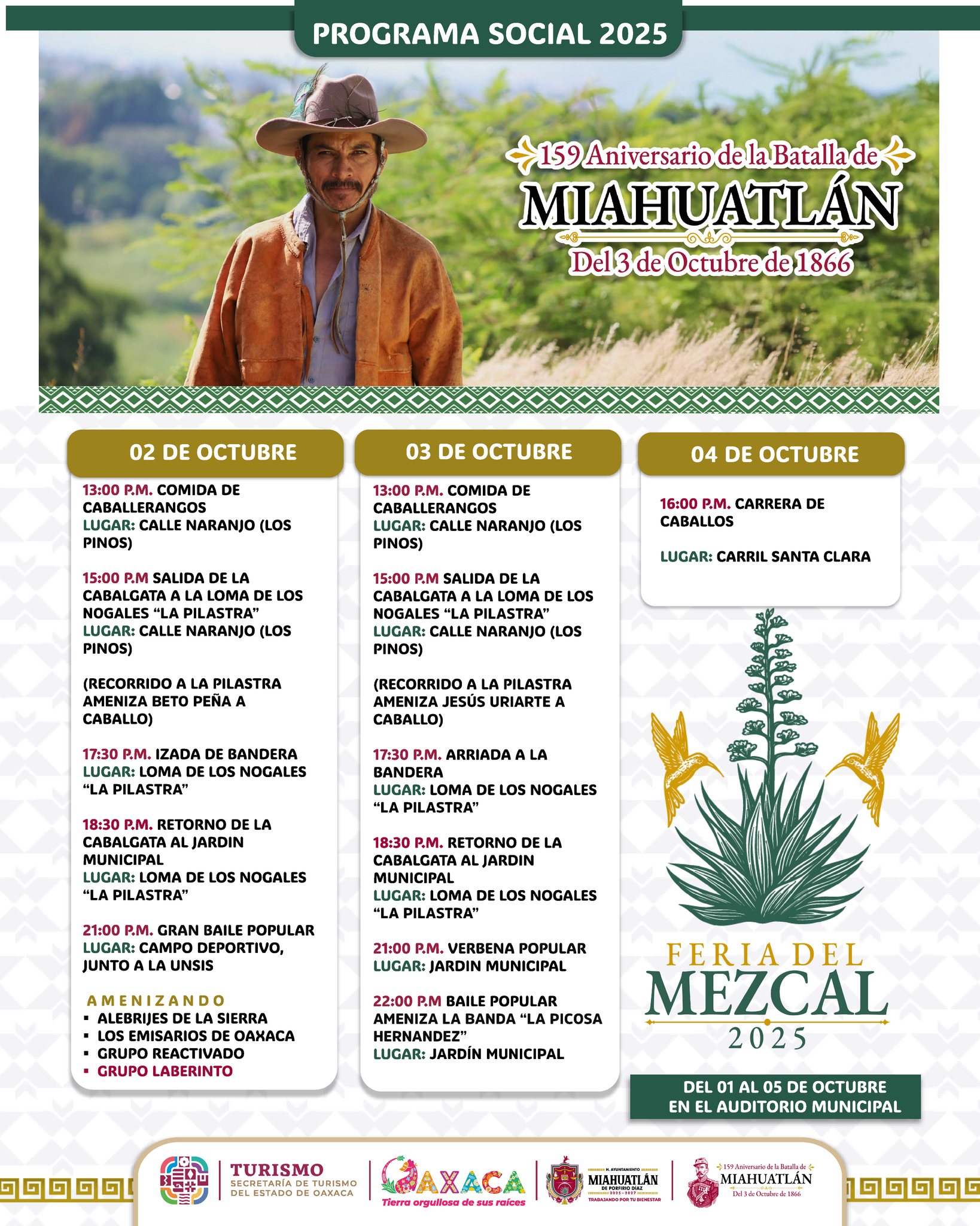 Del 01 al 05 de octubre, ven a conmemorar el 159 Aniversario de la Batalla de Miahuatlán, un evento que te hará vibrar con el espíritu de su historia y tradición.