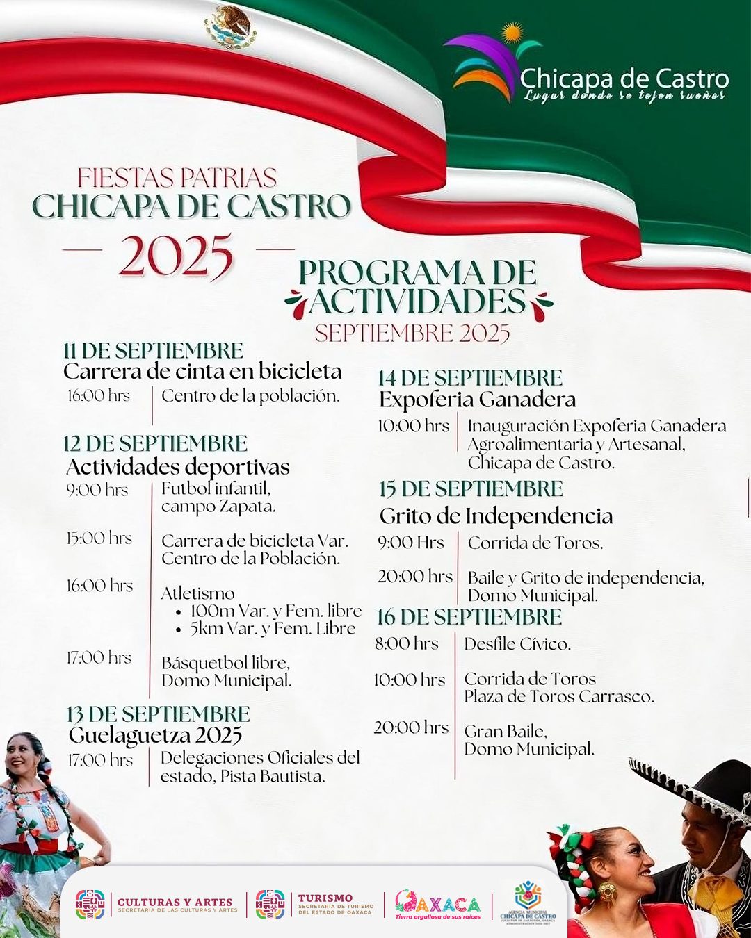 El 13 de septiembre a las 17:00 h, disfruta de la majestuosa Guelaguetza, que llenará de música, danza y color las calles de Chicapa de Castro. El 14 de septiembre a las 10:00 h, se realizará la inauguración oficial de la expo en la Pista Bautista, dando paso a días llenos de actividades culturales, encuentros deportivos, muestra artesanal, baile popular y una emocionante corrida de toros.