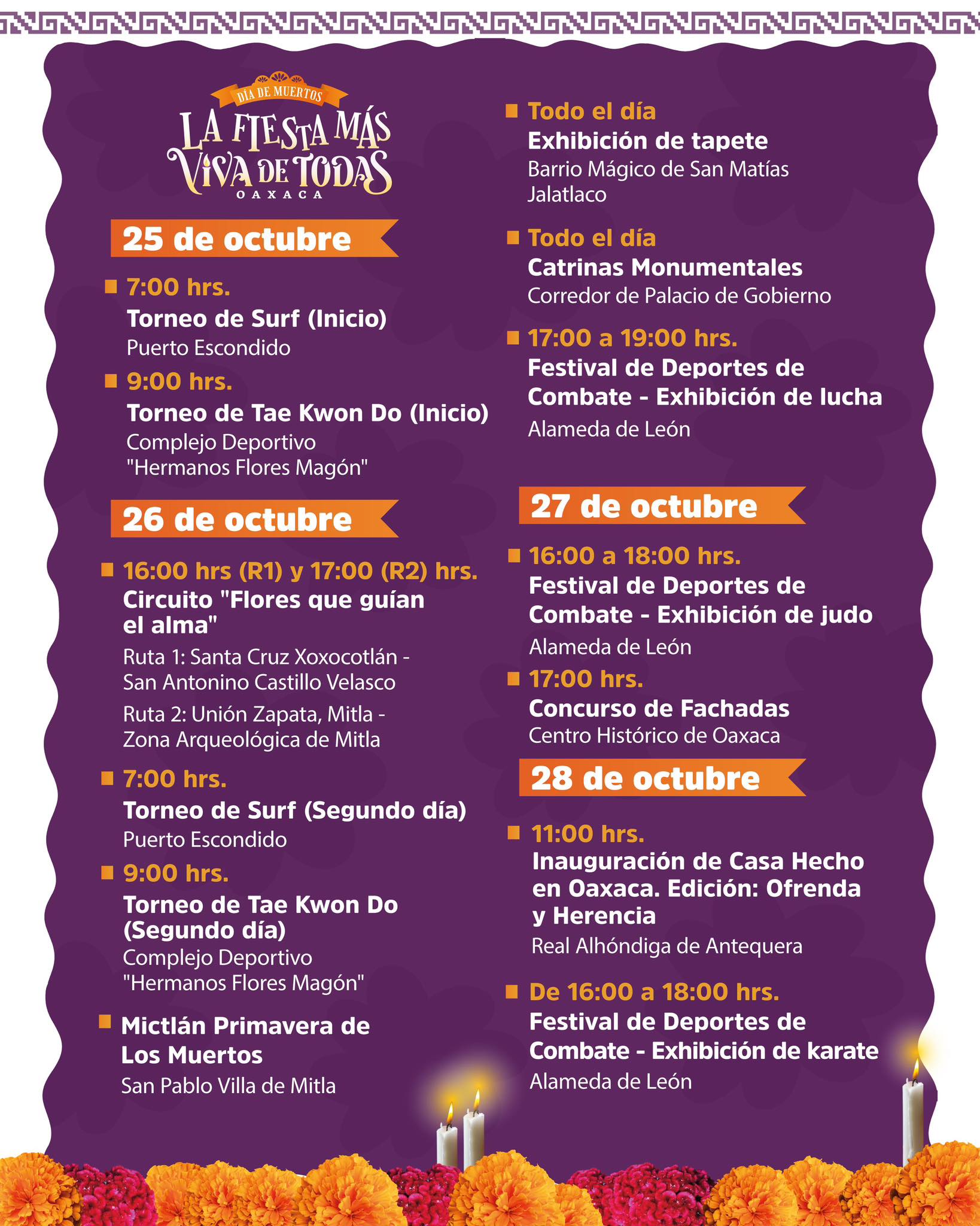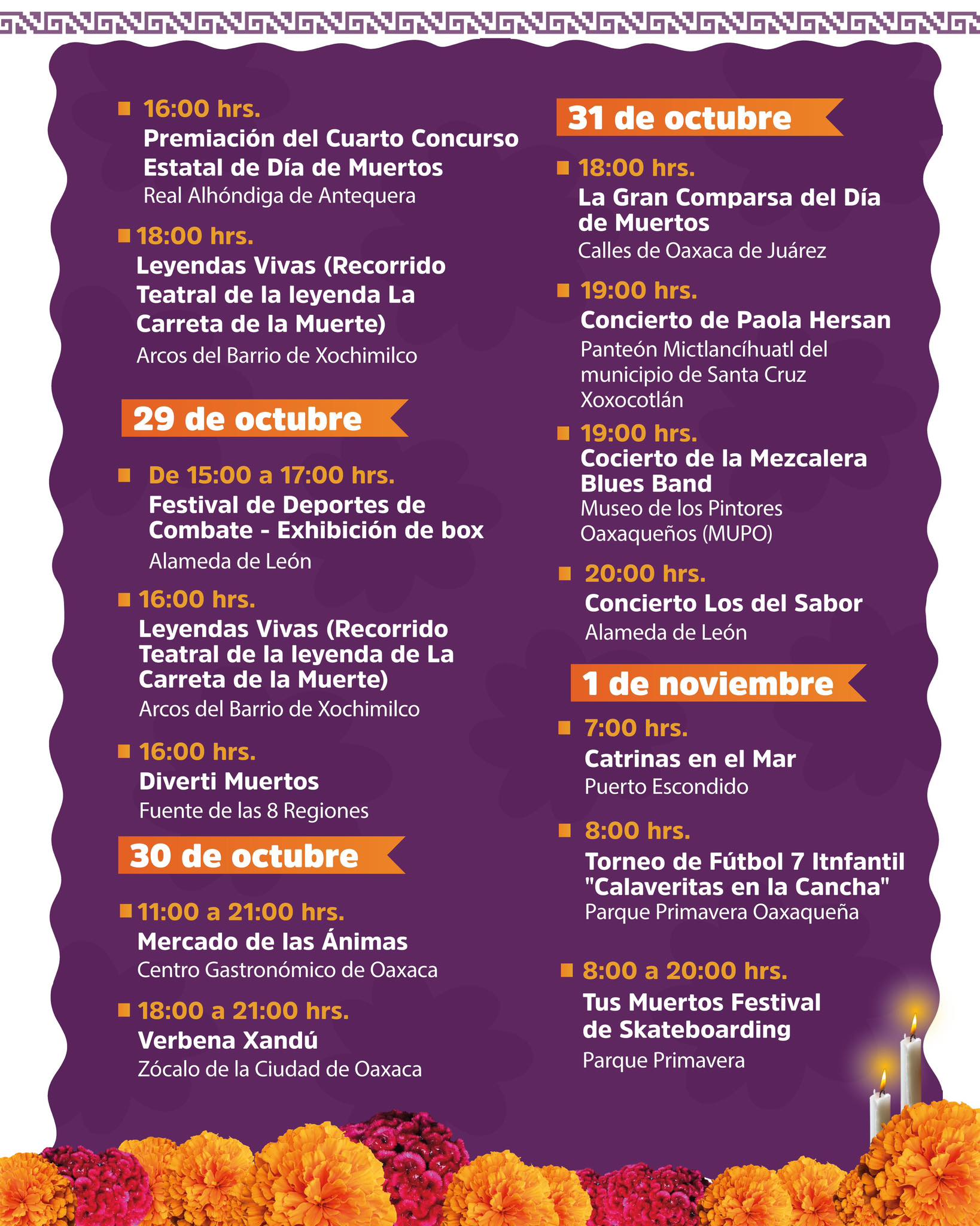 Ver Cartelera: 📝 https://oaxaca.travel/index.php/es/sitios-de-interes-es/guias-turisticas/cartelera-dia-de-muertos-en-oaxaca