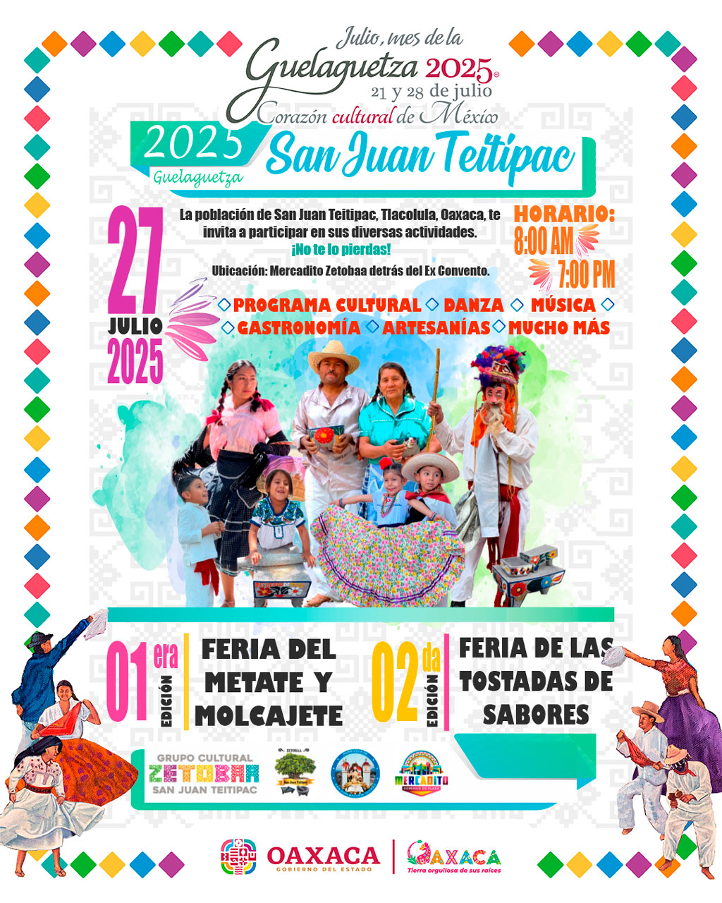 Este 27 de julio, déjate llevar por los colores, sabores y sonidos de San Juan Teitipac, en el corazón de Tlacolula, Oaxaca. La comunidad te invita con los brazos abiertos a disfrutar de un día lleno de cultura y tradición.