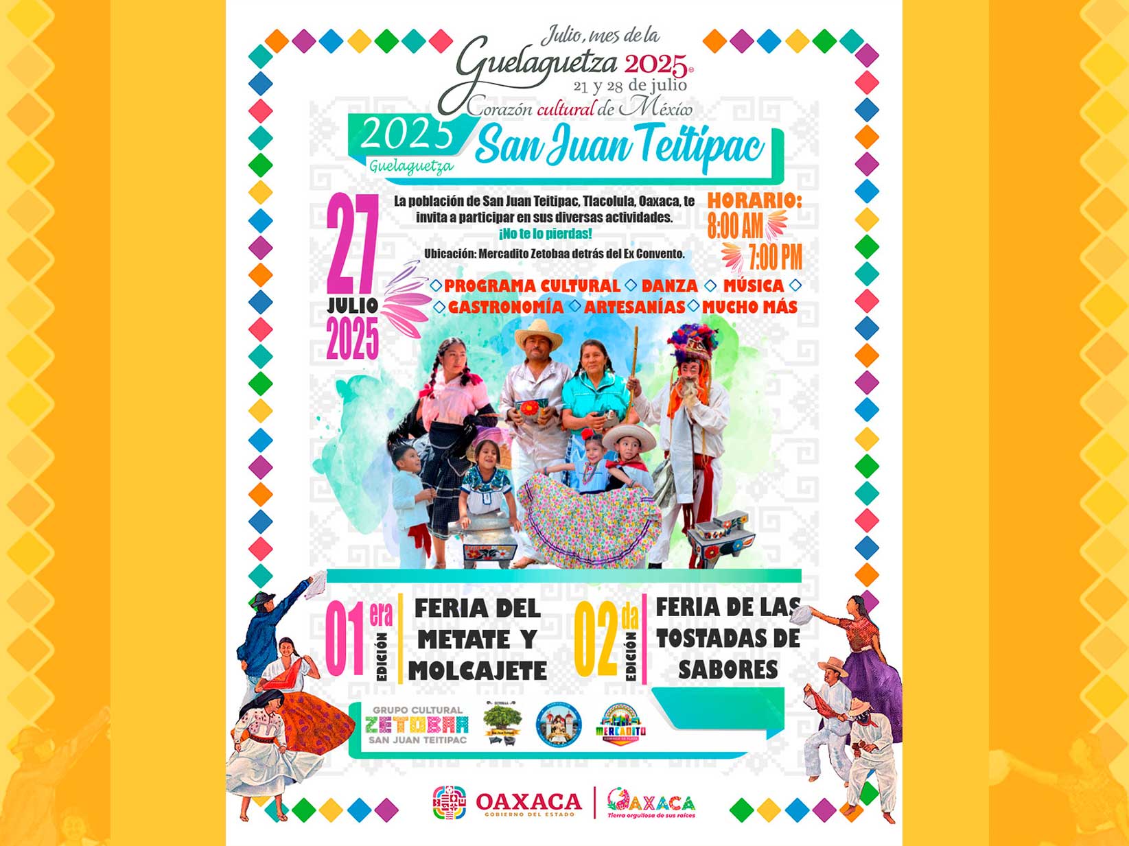 Este 27 de julio, déjate llevar por los colores, sabores y sonidos de San Juan Teitipac, en el corazón de Tlacolula, Oaxaca. La comunidad te invita con los brazos abiertos a disfrutar de un día lleno de cultura y tradición.
